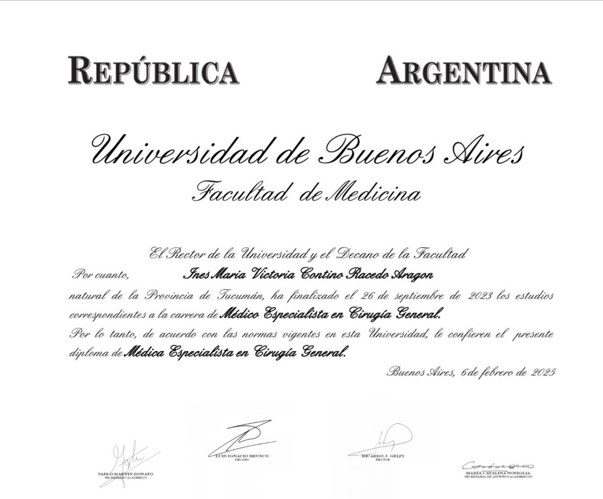 Hola! soy la Dra. Inés Contino Racedo. Soy médica cirujana general por la Universidad de Buenos Aires (UBA), formada en el Hospital Durand.